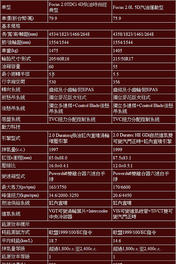 Ford Focus 2.0TDCi 4D/2.0L 5D基本規格表