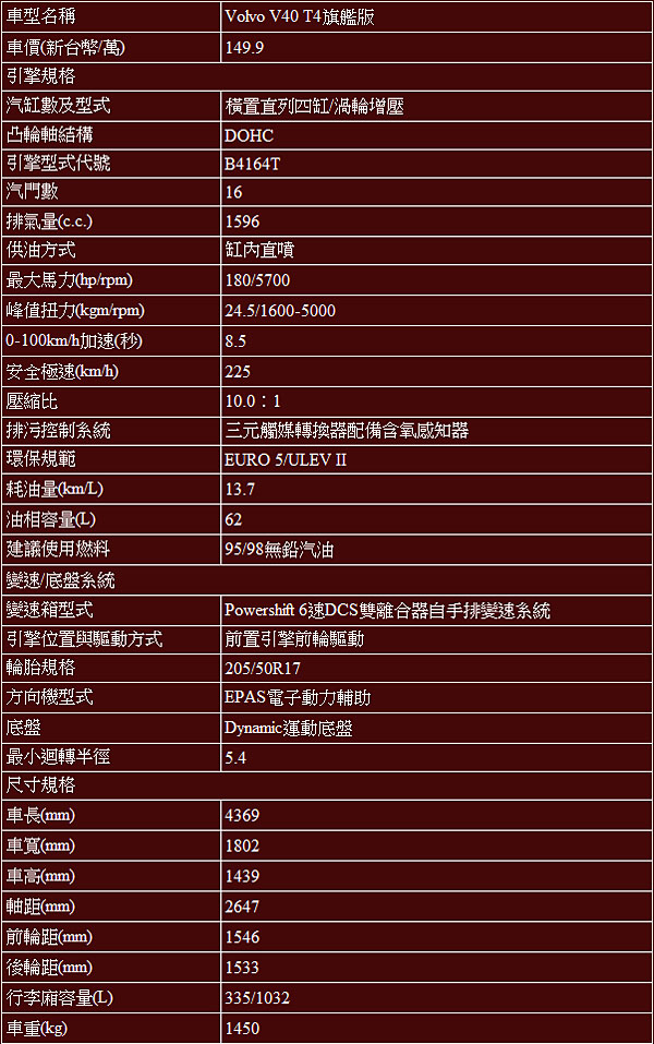 Volvo V40 T4五視圖與基本規格表