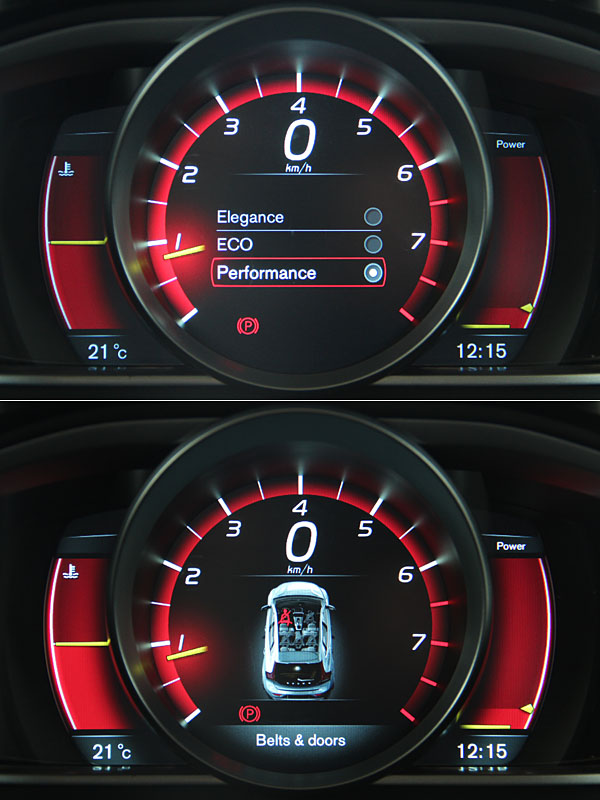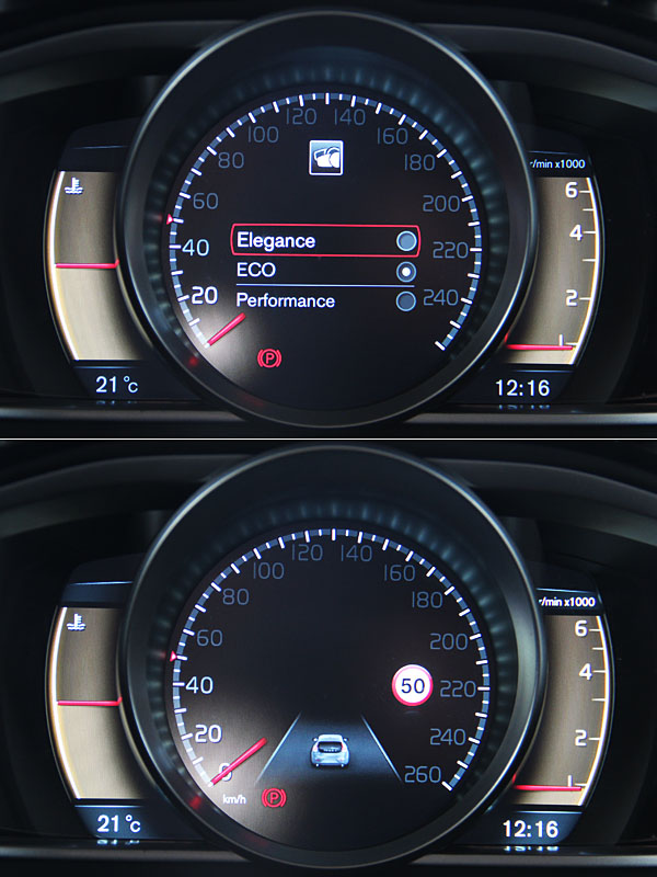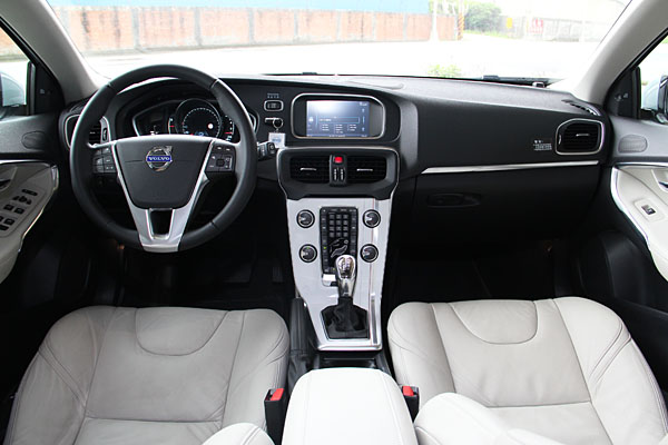 座艙的格局設計,就好比外觀的感受般,乍看之下沒有太多的改革,熟悉的薄片式中控台、新世代的排檔桿設計、整合7吋高解析彩色螢幕的VSi資訊控制介面等。但當你仔細端倪與操作,你會發現中控台於飾板的設計有所不同,可選擇鑲邊條紋套件,添增許多設計感與潮流感受;儀表板更可說是V40車系進化重點,名為個人化高階數位儀表組,以8吋TFT液晶顯示幕為科技基礎,除了以數位化提供駕駛者相關車輛資訊外,更規畫了Elegance、Eco、Performance三種模式,並以琥珀色、綠色、紅色三種專屬顏色區分;有此設計,就是希望在各種訴求模式中,給予駕駛最直接與需要的行駛資訊,其餘較不重要的輔助資訊則加以過濾;看似眩目的新科技,其實仍以主動安全為出發點,期望駕駛能將專注力以前方路況為先,避免因儀表的過多資訊影響駕駛過程,或讓駕駛多了分心的機會。