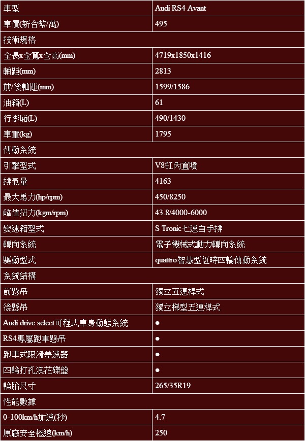 以性能旅行車而論,495萬的身價,RS4 Avant該有的豪華與性能態勢,有著名符其實的演出,與前輩相比,也沒有太失望的精神傳遞;但若嚴苛一點,將最早的RS2列入比較,RS4 Avnat家族的性能表現,其實沒有大幅的躍進,除了引擎容積的提升外,加速成績總在近5秒的範圍游移,引擎輸出的表現除了大排氣量所展現的澎湃外,也沒有太過於激情或細膩的演出,「RS4 Avant是個活在歷史榮光的性能代表」,狠一點,其實我可以這麼說。