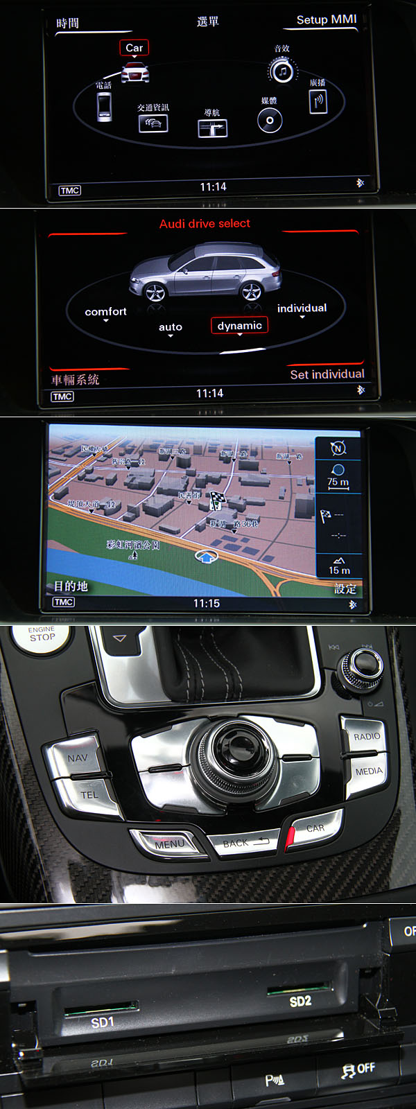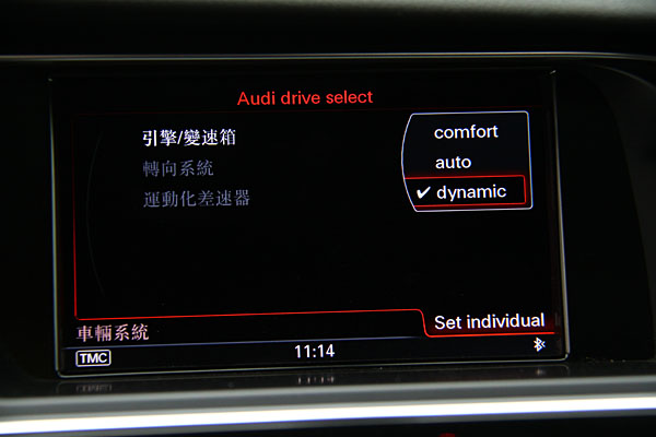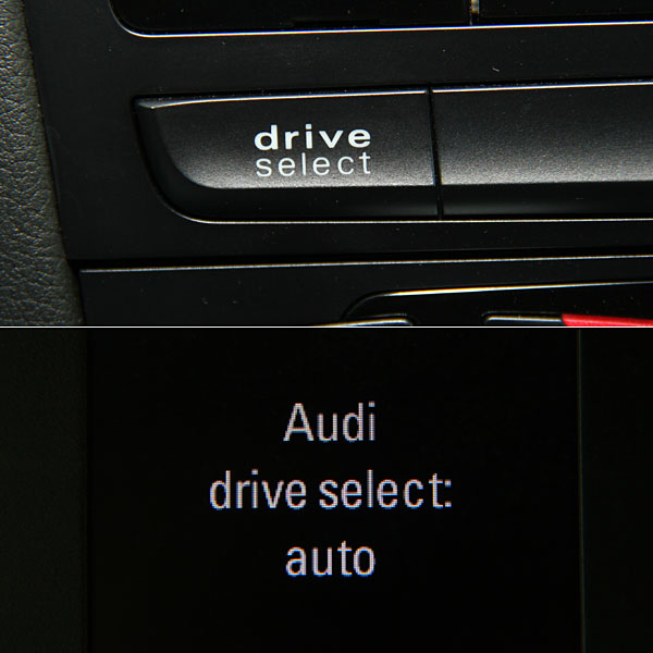 導入Audi drive select可程式車身動態系統,除了可於MMI系統中調整外,中控台下方另有快捷鍵,切換時會於儀表中央DIS顯示系統中顯示當前設定狀態。