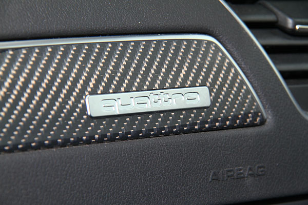 碳纖維飾板上鑲嵌著自豪的quattro智慧型恆時四輪驅動系統的銘牌。