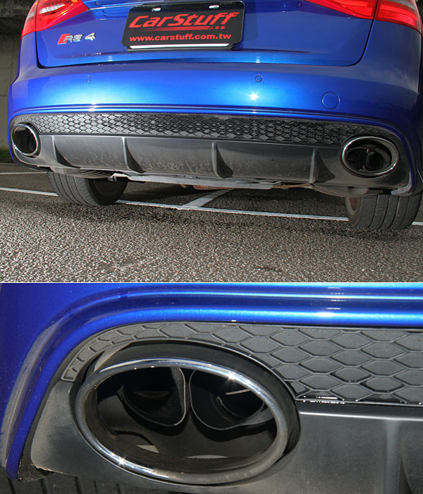 與車頭呼應的蜂巢狀下氣壩整合了左右雙出的排氣尾飾管,且近距離一看,單尾飾管中還藏有雙出排氣尾管。