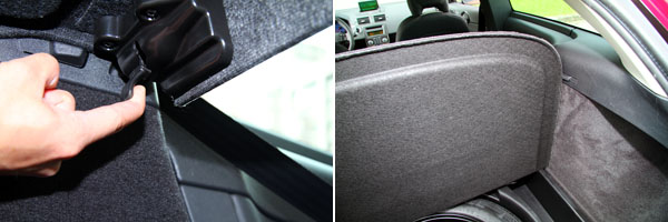 後座椅背可藉由行李廂兩側的拉柄放倒,底板掀起後側邊也有固定卡準,相當方便。