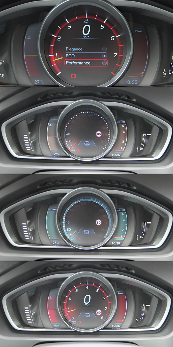 個人化高階數位儀表組中整合的8吋主動式TFT液晶顯示幕,同樣規畫了Elegance、Eco、Performance三種模式,此Elegance模式以琥珀色呈現,Eco模式改為綠色,Performance則為紅色。