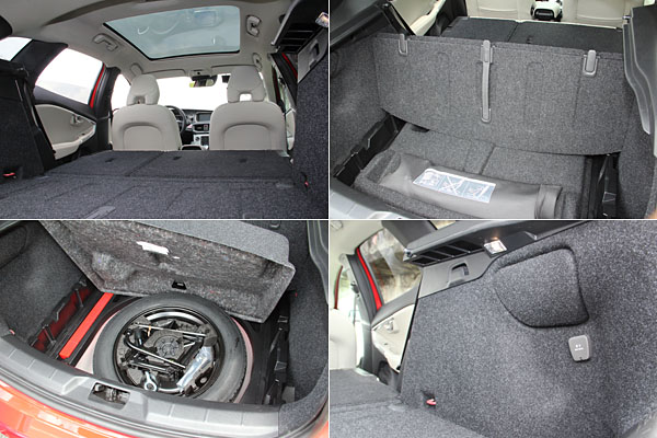 從左上圖片角度可以一見後座椅背傾倒後的後廂平整度;此外後廂底板提供了三種的開啟固定模式,且掀起後,下方還有一隔音罩,最下方才是備胎工具組。