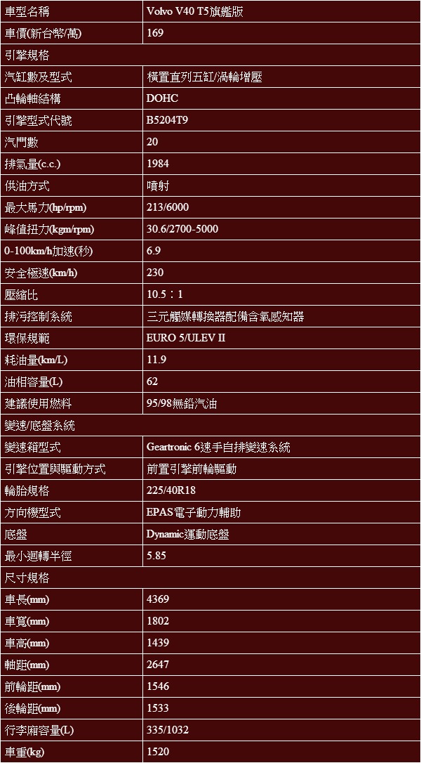 V40 T5搭載直列五缸渦輪增壓汽油引擎,可輸出213hp/6000rpm最大馬力與30.6kgm/2700-5000rpm峰值扭力。
