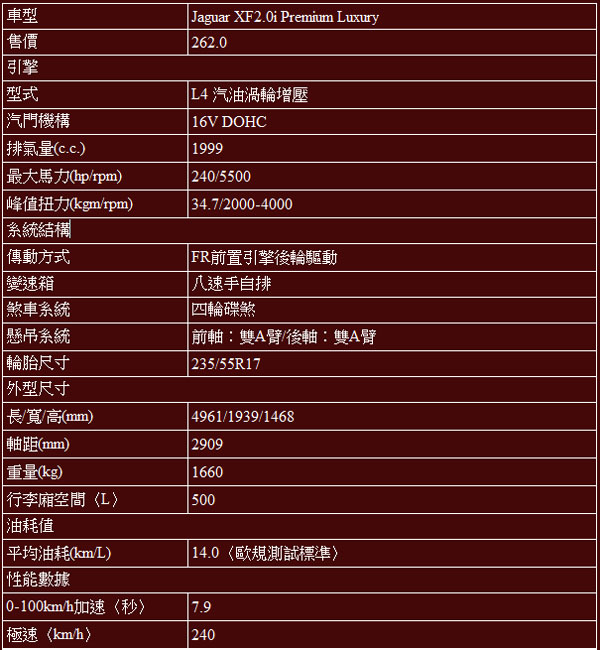在眾多車廠開始以小排氣量引擎搭配增壓系統取代大排氣量自然進氣引擎的趨勢下,Jaguar亦於XF與XJ車系開始導入2.0升渦輪增壓汽油引擎,以同水準的動力輸出,取代原來的3.0升V6自然進氣引擎,而本次試駕XF 2.0i Luxury就是在這波動力更替工程中最主要的車型之一。