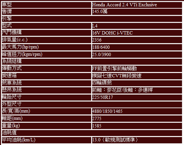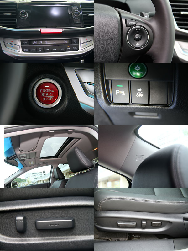 包括:雙區恆溫空調、PUSH START引擎啟動鈕、電動天窗、定速巡航系統、VSA車身動態穩定控制系統、車側氣簾、駕駛座八向電動調整座椅〈附兩組記憶功能〉、副駕駛座四向電動調整座椅皆為Accord 2.4 VTi Exclusive 車型標準配備。
