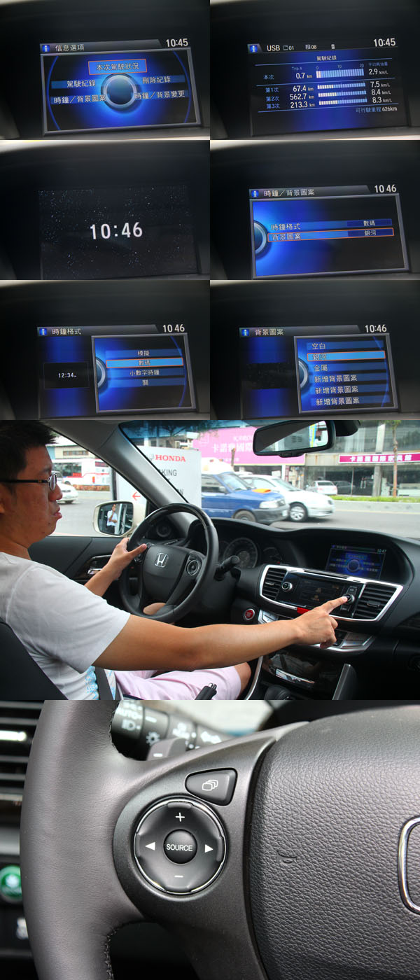 有了開闊的乘坐空間,為挑戰進口中大房車市場,Honda Taiwan強化了全新Accord的配備內容,首度將八吋i-MID資訊整合系統、五吋觸控音響系統、中文化衛星導航系統皆列為標準配備,讓全新Accord有著以往所沒有的科技感,不過由於是第一次接觸這組全新的音響與資訊整合系統,因此在試駕過程,花了不少時間去習慣它的操作邏輯,經過兩天的相處,發現在整體操作上不若以往車型所搭載之系統來得便利,首先,在新配置的五吋觸控音響系統部分,完全將以往擁有許多按鍵的音響系統整合於其中,除了可藉由觸控螢幕操作外,也必須配合右側的多功能旋鈕組使用,在部分選項中,會出現不知道該用觸控、還是用旋鈕的情形,相似的情形也出現在八吋i-MID資訊整合系統上,由於八吋i-MID資訊整合系統的顯示項目切換,是以方向盤左側的換頁快捷鍵操作,而換頁快捷鍵下方的四向選擇健與中央的SOURCE鍵則僅提供音響快選功能,未支援i-MID資訊整合系統內容選擇操作,因此,在切換i-MID資訊整合系統顯示項目後,欲調整顯示項目之內容設定,則又必須使用中控台上的整合選紐,例如:當我們要將音響訊息切換至行車電腦資訊時,須用方向盤上的換頁鍵進行頁面改變,但要調整或將行車電腦資訊歸零就必須用音響右方的多功旋鈕,很容易造成邏輯錯亂的情形,需要花許多時間適應,若是再加上可用中控台上方螢幕觸控操作的中文化衛星導航,三組介面的整合性仍有待加強,是較為可惜的地方。