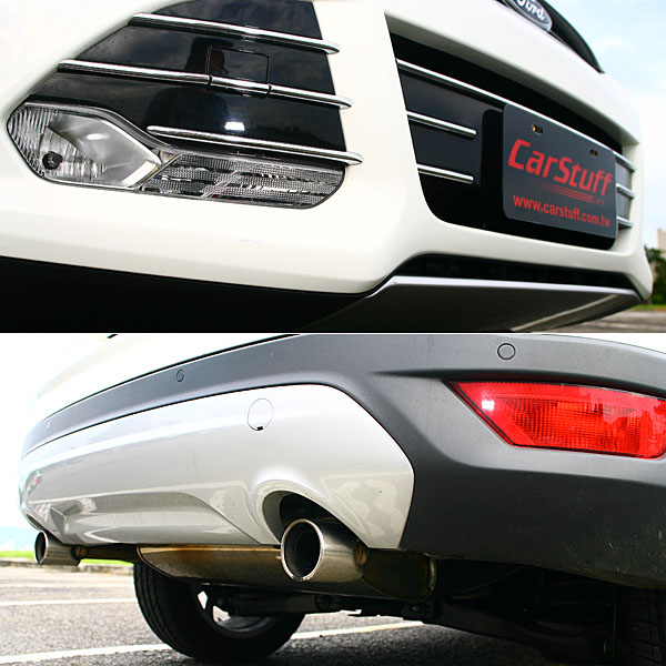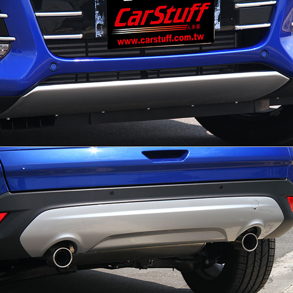 前下氣壩導入前霧燈,後保桿下方也有下護板與左右雙出排氣尾管設計。