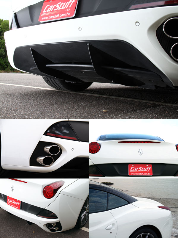 相較於458 Italia那般充滿強烈戰鬥氣息的外表,250 GT California Spyder多了分優雅與從容,在修長車頭與短捷座艙、車尾所組合的基本架構下,有著傳承250 GT California Spyder的經典方形引擎蓋進氣口,同時,藉由前後隆起的輪拱,勾勒出超跑的肌肉與力量感,車尾部分則是以俐落的下切線條收尾,搭配著左右各一的圓形尾燈組,以及左右直列雙出式排氣管,中央下方則是有為提升空力效應的分流器,同時融合了復古與前衛風格,並且還兼具了空氣力學設計,每一道鈑件刻線與曲線,都賦予了導引氣流的責任,讓氣流可以順利的劃過California 30,讓California 30奔跑起來就像是一把劃破空氣的利刃,就算是家族中的小老弟,依舊展現相當足夠的氣勢,
