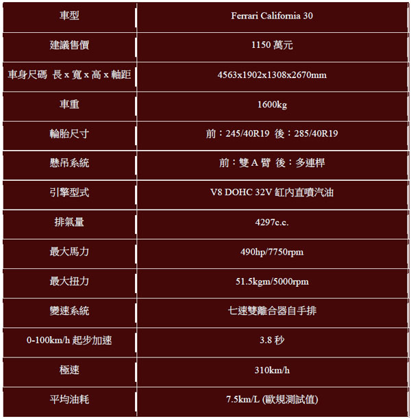 但是回顧Ferrari歷史,採用前置引擎、後輪傳動配置的產品,比起中置引擎車款要來得豐富,除了強大性能與極致操駕樂趣,還要能夠兼具長途駕駛,讓車主咨意享受駕跑車旅行的特色,同樣在Ferrari一貫所追求的傳統,如今的一代馬王F12 Berlinetta與本次試駕的California 30都是採前置引擎後輪驅動設定,在眾多超跑中展現出傳承血統的無比魅力。