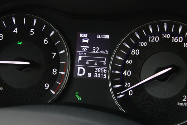 DCA系統啟動後,此時儀表內的顯示幕便會出現以三條不等長橫線、猶如金字塔造型的標誌,由上至下代表著車距控制的距離遠近,三條線同時出現,表示DCA系統監控車距最遠,而調整至僅有下方一條線時,則表示監控車距最近,此讓駕駛可依照行駛速度自行切換。