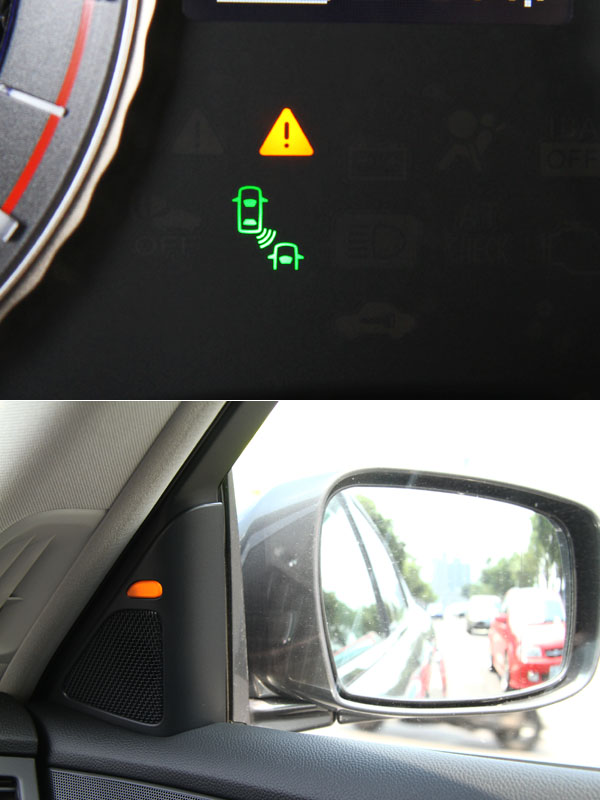 Safety Shield行車主動防護科技同樣可從控台上方VIS行車資訊系統中設定,主要可針對DCA、LDB、BSI三大系統選擇開啟或關閉功能。全數開啟後,先從較為熟悉的BSI盲點側撞預防系統附警示功能開始介紹,此目前已廣泛運用在車輛上的此輔助技術,乃是針對兩側後視鏡與車內後視鏡所無法照射到的盲點加以偵測,此區域如有車輛出現,位於兩側後視鏡內側的警示燈便會亮起提醒駕駛,而在市民大道的駕駛過程中,此系統盡忠職守,當兩側有車輛靠近時,警示燈便會亮起以作提醒之用,避免了駕駛誤判或粗心切換車道後所會發生之意外碰撞,由其在台灣道路環境擁擠狀態,此系統確實相當實用。