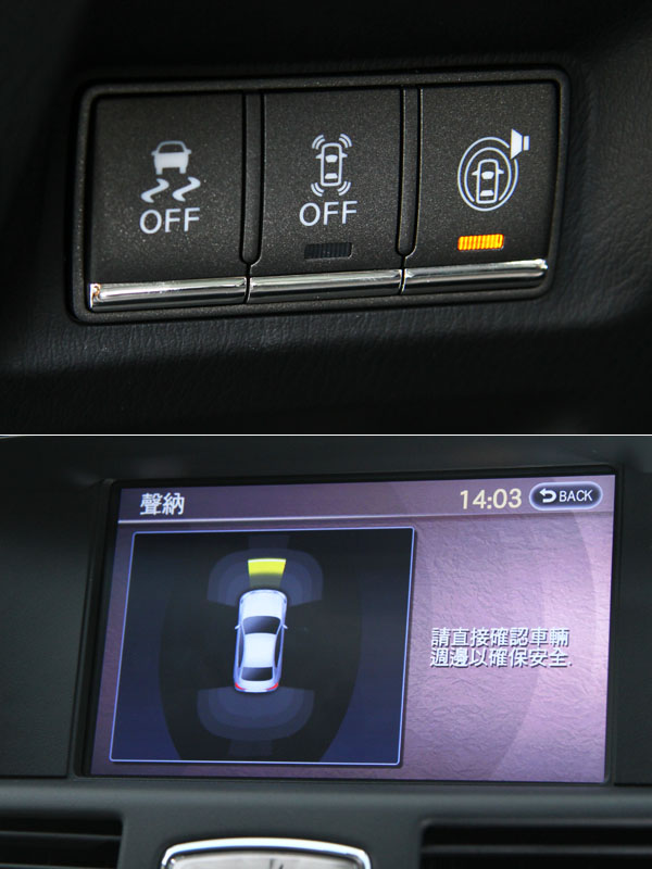 透過全車周圍的偵測系統,除了提供駕駛周全的警示與輔助功能外,也具備倒車路徑預覽彩色顯影系統。
