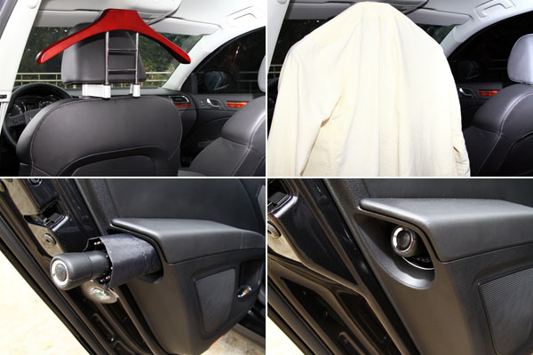 台灣引進地Superb Combi 2.0 TDI於駕駛座後方還附有原廠衣架,便於吊掛西裝等衣物,另外獨有的隱藏於左後門內的置傘槽仍就予以保留,原廠也附贈一把專屬的摺疊傘。