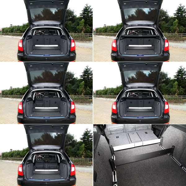 以Superb Seden不到4.9m的車長及2761mm軸距,在數據上並不特別亮眼,但是在車室內空間部分卻有超乎想像的優異表現,由其是在縱向空間部分,後座腿部可延展的闊綽程度比美軸距達到2900mm以上的大型房車,因此在此基礎下讓Combi車型,也同樣延續了高水準地空間表現,行李廂在一般狀態下即有633L的容積,在空間擴充機能部分,Superb Combi除了可將後座椅背翻倒外,還可以將後座椅墊向前翻起,讓椅背完全向下收納,以騰出平整的置物空間,而且與其他旅行車大多保留輪拱造型、未善用畸零空間的設計相較,Superb Combi則是直接將行李廂兩側採平整化設計,直接將輪拱部分納入車側隔層中,同時也將畸零空間部粉以蓋板隔開,不僅較為美觀,也可以有效利用空間,再輔以固定鉤、可拆卸式照明燈組等增加置物機能,另外,還隨車配有可滑移式地橫向隔桿與伸縮隔環,讓車主可依據載物需求,彈性運用。