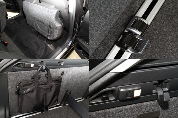 後座椅墊可向前翻起增加行李廂的空間延展機能,另外滑軌式置物固定鉤、側邊置物掛鉤與可拆卸下來當作手電筒的照明燈都是標準配備。