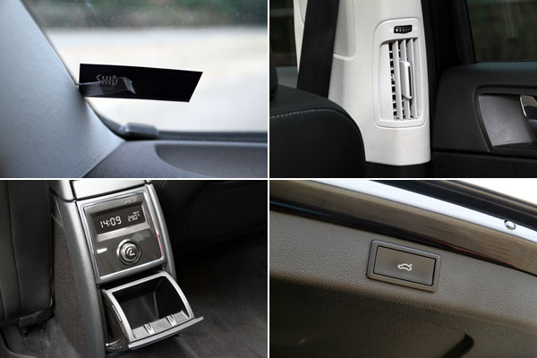 Superb Combi 2.0 TDI車內也配有許多貼心的設計,包括前檔下緣設有紙夾,臨時停車時可留聯絡紙條,並且還有B柱後座空調出風口、電動啟閉尾門等配備,後座中央癌附有簡易功能的液晶螢幕,顯示時間與車外溫度。
