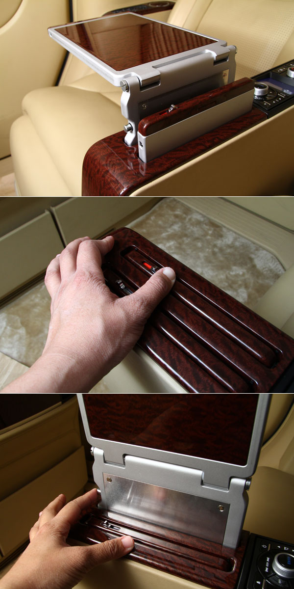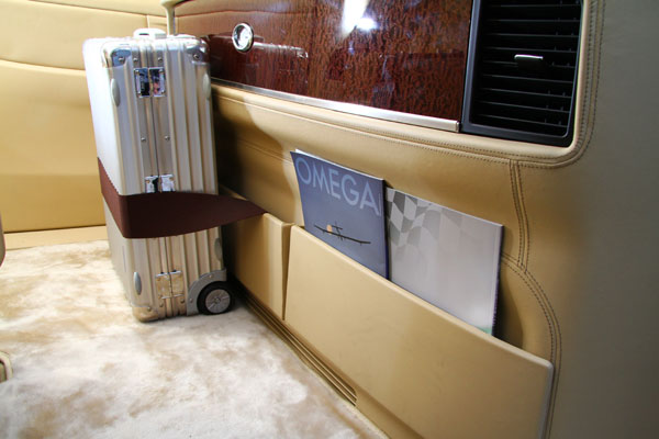 提及中央扶手,前方乃是前段所述的核桃木紋折桌,此設計於收放操作不難,但桌面面積較小,且以其設計位置需要將椅背豎直後較易使用,如能參考飛機商務座艙提供的桌面前後滑移功能,應會更易於使用;而收納折桌的後方,則是後艙獨立影音播放控制系統,採取單片式CD/DVD讀取格式,輕按開關鍵,播放介面便會傾斜一側讓光碟退出或插入,而在此播放系統中,除了完整的影音控制系統外,還整合了包含私密隔屏、空調、車窗升降、車門啟閉、氣氛燈調整與前後艙通訊系統等操作介面,且以明顯圖樣與大面積按鍵設計,操作起來也相當輕鬆就手。