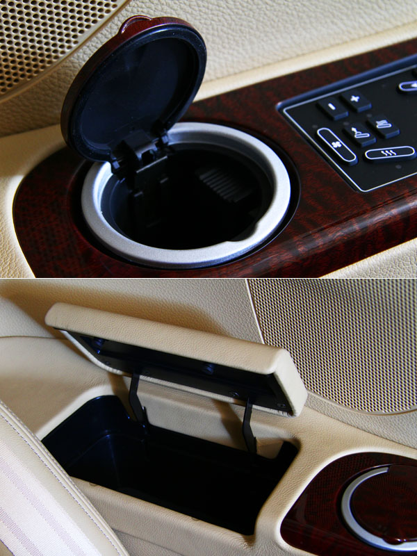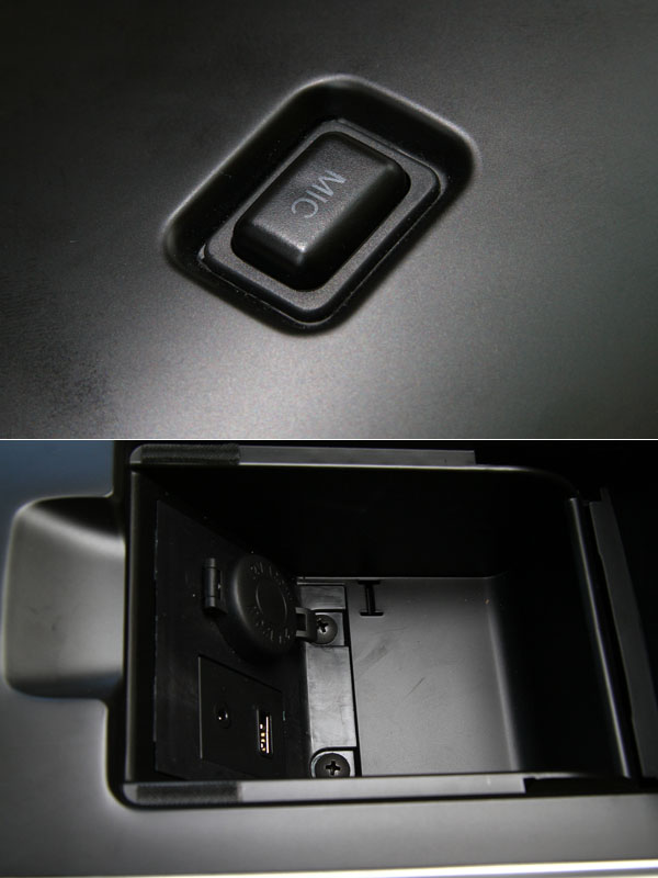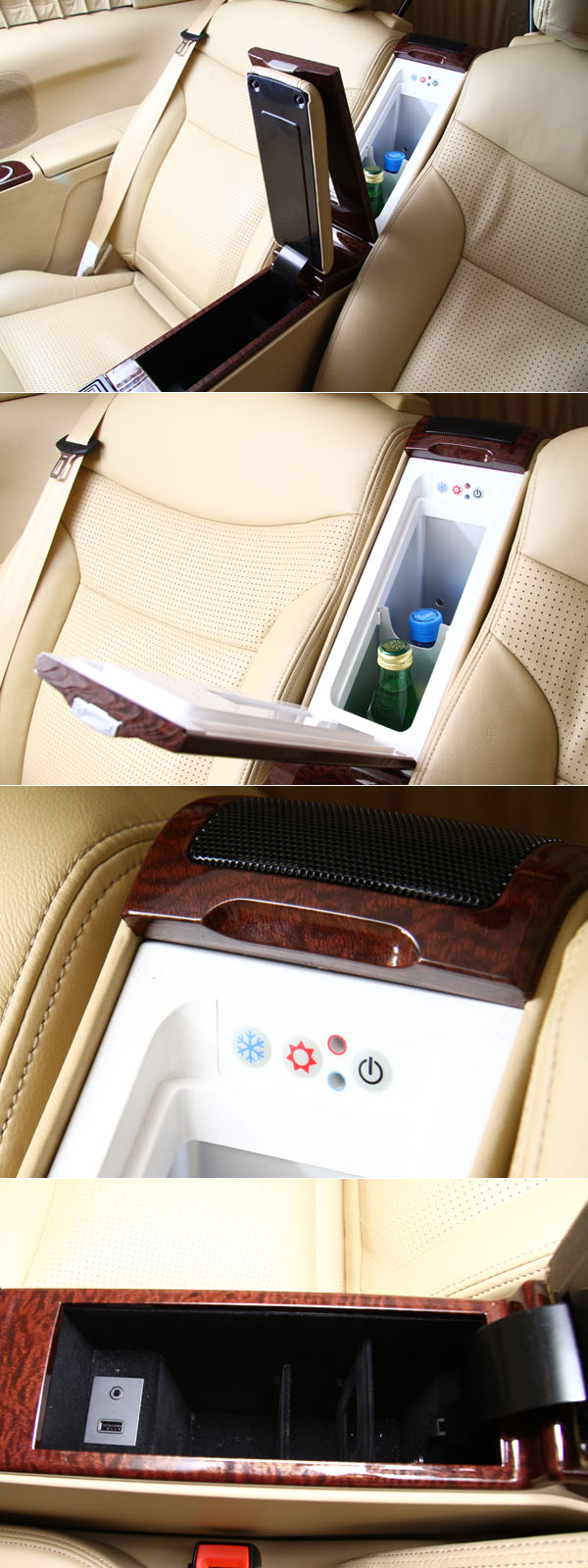 可容納375c.c.與600c.c.兩容積的冷熱雙用冰箱之前,乃是扶手下的置物盒空間,下方還具備AV-IN、USB與AUX-IN插孔。