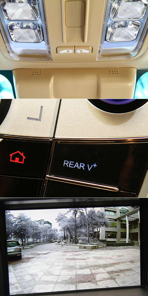 由於私密隔屏設計,取消了車內後視鏡配置,改以後方攝影機取代,只需按下控台上的〝REAR V+〞按鍵,便可觀看後方視野。