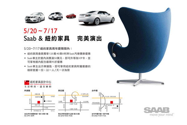 精品家具與豪華高級汽車除了頂端客層之同質性外,設計專業領域中對傳統工法或現代尖端科技的追求,設計師們對原創理念的堅持有著異曲同工之處,因此此次5/20~7/17紐約家具設計中心周年慶期間,Saab汽車為共襄盛舉特地安排有「豪華私人專機」之稱的The new Saab 9-5為其站台,跨界合作即是以此核心而衍生出的代表性案例。