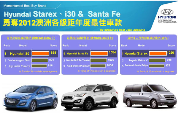 又獲獎了,Hyundai在澳洲有三部車勇奪2012澳洲各級距年度最佳車款。
