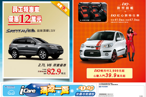2010年5月份,現代汽車以車商最大舉動,將員工特惠車的方案直接優惠新台幣12萬元回饋給消費者造成莫大的話題及車市震撼;6月份現代汽車繼續延長此方案,進口等級的2.7L V6汽油引擎的LSUV Santa Fe,原價新台幣94.9萬,只要82.9萬元起即可入主,擁有高級車款已不在是難事!