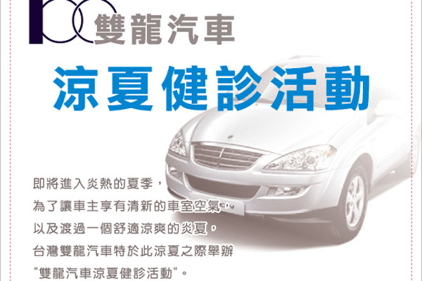 遲來的春雨帶來陰鬱潮濕的氣候,颱風季節也即將來臨,為讓車主擁有清新舒適的車室環境,同時確保用車安全,秉持專業柴油動力、樂於營造樂活休旅生活的SsangYong雙龍汽車,即將在6月1日至30日為車主獻上涼夏健診,歡迎所有雙龍汽車車主在活動期間內,蒞臨雙龍汽車全國授權服務廠,接受全車功能檢查等安全檢測,更有機會免費享「空氣品質淨化專案」。