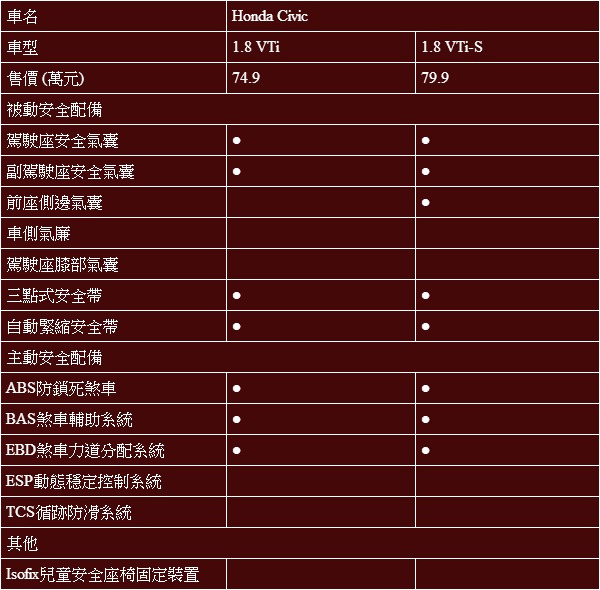 品牌性能風格明顯的Honda Civic,近來由於售價拉高以及原廠產品定位的影響,已逐漸離開以往的性能氣息與改裝風氣,取而代之的是人因工學更加完善的駕駛氛圍營造。然而,在安全配備的堆砌上,入門的1.8 VTi車型搭載2具安全氣囊,搭配ABS+EBD+BAS煞車系統與自動緊縮安全帶,高規的VTi-S車型則是增加前座側氣囊,讓安全氣囊增加至4具,但ESP動態穩定控制系統與TCS循跡防滑控制系統的卻付之闕如。
