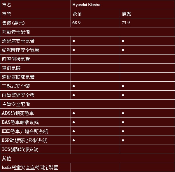 Hyundai在導入流體雕塑設計語言之後,新一代的Elantra以流線的造型美學,緊抓住年輕一輩消費者的目光,也帶來不俗的銷售表現。採用1.8升單一動力策略的Elantra在安全配備的鋪陳上,雖然劃分豪華型與旗艦型兩款車型,但無論是入門68.9萬元的豪華型或高階73.9萬元的旗艦型,皆搭載雙前座安全氣囊、自動緊縮安全帶以及ABS+EBD+BAS煞車系統,同時全數標配ESP動態穩定控制系統,在國產1.8升中型房車中,擁有不俗的主動安全配備等級。