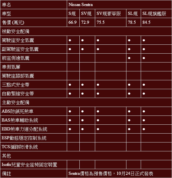 睽違市場多年的Nissan Sentra預計在2013年10月24日重回臺灣市場,借用Nissan在中國的新一代Sylphy作為基礎,搭載1.8升單一排氣量引擎的新一代國產Sentra,擁有更大的乘坐空間、舒適度以及更為節能環保的動力表現。撇開動力規格與舒適配備不談,劃分S規、SV規、SV規豪華版、SL規與SL規旗艦版等5種車型的新一代Sentra,在SV規豪華版以下標配前座雙安全氣囊與ABS+EBD+BAS煞車系統,高階的SL規與SL規旗艦版,則是增加前座側邊安全氣囊,讓安全氣囊總數來到4具之多。然而,與多數國產1.8升中型房車形同的是,ESP動態穩定控制系統仍未在配備清單之中。