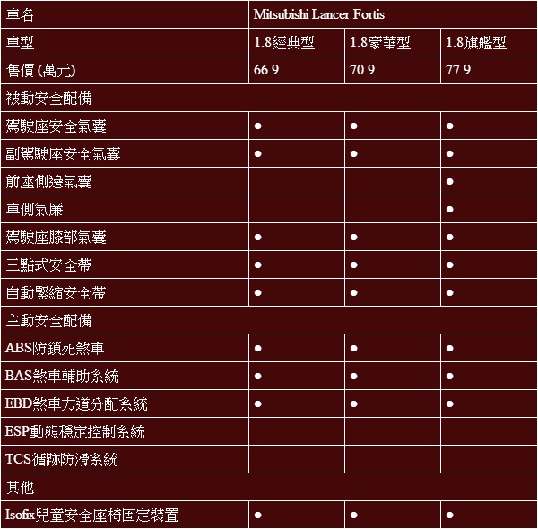 無論是2007年下半年在臺灣現身的Lancer Fortis 2.0,或是2008年4月下旬推出的Lnacer Fortis 1.8,雖然在2011年11月時一度歷經小改款更新,但面對各家對手,仍難免有產品世代較舊的劣勢。不過,即使在臺灣市場發表已有超過5年的時間,Lancer Fortis 1.8仍然保有當初的安全配備策略,即便入門的1.8經典型與1.8豪華型,皆搭配雙前座安全氣囊與駕駛座膝部氣囊等3具安全氣囊,搭配ABS+EBD+BAS煞車系統與Isofix兒童安全座椅固定裝置。高階的1.8旗艦型,則是增列前座側邊氣囊與左右車側氣囊,讓氣囊數增加至7具之多,雖然沒有ESP動態穩定控制系統,卻透過充足的氣囊數佔有優勢。