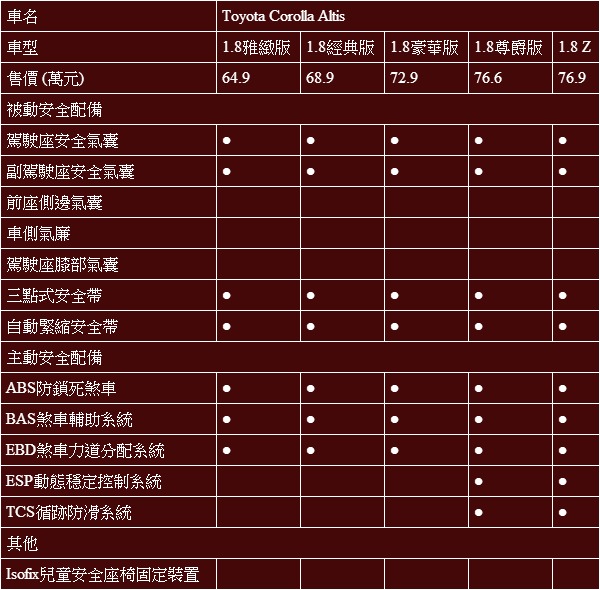 2013年10月,國內單一車種銷售冠軍的Toyota Corolla Altis正式進行改款更新,推出第11代Corolla車系,同時也是國產第3代Corolla Altis。披覆更具歐風動感面容的同時,也取消過去的2.0升動力,改採1.8升單一排氣量策略。在過去多為消費者所不滿的安全配備規劃,到了新一代Corolla Altis身上,其實並未有顯著的進步,全車系僅標配雙前座安全氣囊、自動緊縮安全帶與ABS+EBD+BAS煞車系統。雖然導入了年輕消費者注重的VSC動態穩定控制系統 (ESP) 與TCS循跡控制系統,卻僅只有在高階的1.8尊爵版與1.8Z車型上得以見到。期待銷售冠軍Corolla Altis能夠透過龍頭的地位以身作則,提升國產中型房車安全防護等級的消費者可能會有不小的失望。