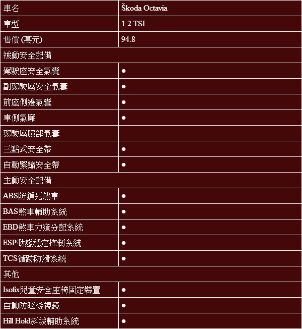 另外,身為Škoda家族入門中型房車的Octavia 1.2 TSI,雖然國內開出94.8萬元的建議售價,但放眼國際車壇,歸類C-Segment級距房車的Octavia與國內的1.8升中型房車仍屬同一級距。然而,在安全防護的水平上,卻透過雙前座、雙前座側邊、車側氣廉等6具安全氣囊,搭配自動緊縮安全帶、ABS+EBD+BAS煞車系統、ESP動態穩定控制系統、TCS循跡防滑控制系統、自動防眩後視鏡、Hill Hold斜坡起步輔助系統與Isofix兒童安全座椅固定裝置等,建構出完善且充足的安全防護。