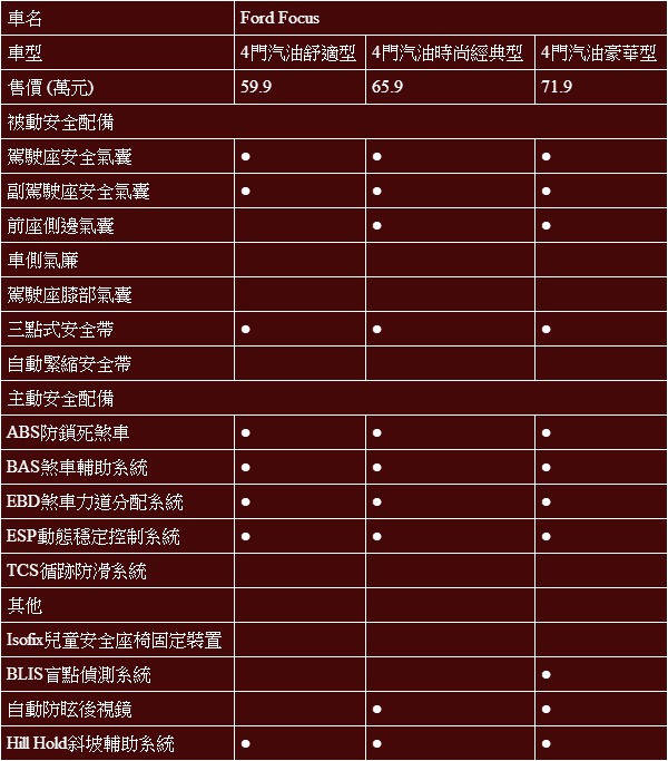 在兵家必爭之地的國產1.8升中型房車級距之外,CarStuff人車事也拉出雖然動力等級不同,但價格帶接近的國產中型房車Ford Focus 1.6,以及進口中型房車Škoda Octavia 1.2 TSI作為代表,提供讀者作為比較,評論臺灣汽車市場最熱門級距的各款產品安全防護是否足夠。其中,劃分3車型等級、價格介於59.9萬至71.9萬元間的Focus 1.6房車,全車系標配2具安全氣囊,除ABS+EBD+BAS煞車系統外,同時標配ESP動態穩定控制系統與Hill Hold斜坡起步輔助系統,從中階的時尚經典型起亦將前座側邊氣囊列為標配。而高規的豪華型,還添加自動防眩後視鏡以及BLIS盲點偵測系統,卻僅開價71.9萬元。