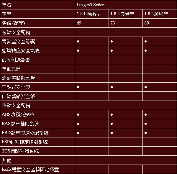 裕隆集團自主品牌Luxgen旗下的首款房車作品Luxgen5 Sedan在2011年12月現身亮相,並在2012年8月正式發表上市,採用2.0升與1.8升雙渦輪增壓動力的陣容瞄準臺灣最大宗的中型房車市場。擔任入門動力的1.8升渦輪增壓引擎劃分有精緻型、尊貴型與頂級型等3種動力,售價69萬至80萬元不等。在主、被動安全配備的鋪陳上,採用相當一致的策略,盡數標配雙前座安全氣囊與ABS+EBD+BAS煞車系統,近來受到網路消費族群關注的ESP動態穩定控制系統則未能見到。