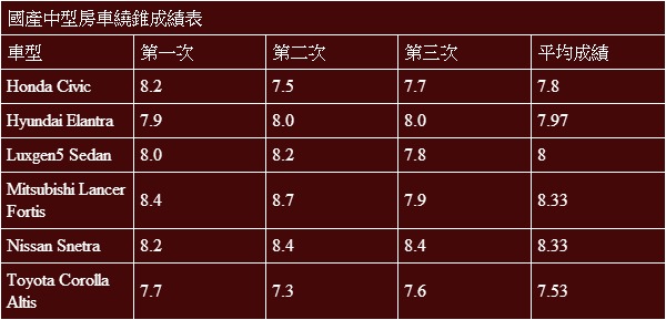 從Sentra三次相當一致的成績可以證明前述事實,該車的穩定度與易控性與Elatra幾乎可並列六車中最好的,要是CVT變速箱反應能夠再明快些,或者可以模擬固定檔位好好控制轉速的話,時間必可再向前推進個0.2秒沒問題。