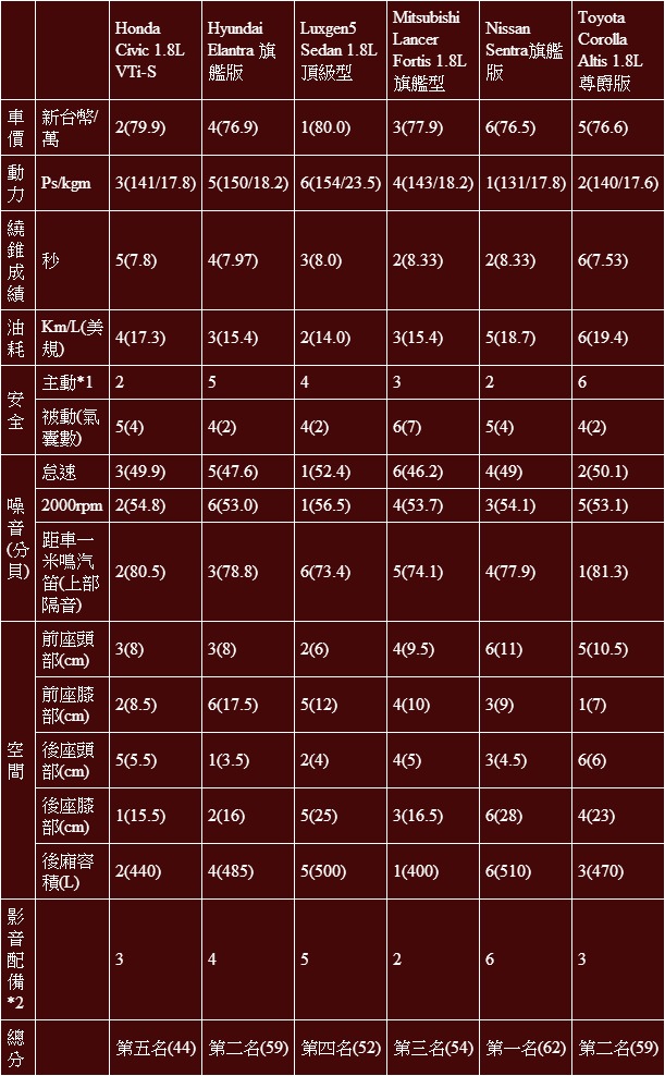 從數據說話的評分項目中,可以發現到在所可獲得的原廠數據與實際量測的量化標準中,Nissan Sentra獲得了最高分,其實也可以明顯發現,除了動力面與關係操控表現的繞錐成績兩項居於絕對弱勢以外,在油耗、佔了多數的空間測量方面,強調「中大型」、也就是期望以上打下此中型房車級距的Sentra有著明顯優勢,也是讓其獲得最後冠軍的因素。
