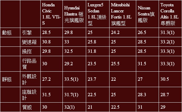 而主角之一的Toyota Altis,如同編輯觀點所指出的,此次的有感進化表現傑出,除了一枝獨秀的油耗表現外,操控面也有明顯進步,加上不俗的空間格局,讓其以亞軍作收,說實在的一點也不意外。另外與Altis並列亞軍的Hyundai Elantra,整體分數平均的位居前段班,綜合後同樣獲得亞軍,展現出其整體均衡且優異的產品實力。