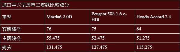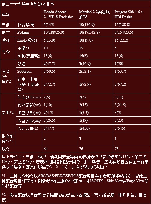 將之量化之後,令人驚訝的是Peugeot 508與Mazda6兩輛柴油車的分數會如此接近,其中508在價格、油耗、空間與上部隔音均有相當不錯的表現,而Mazda6則勝在主動安全以及全方位均衡表現(幾乎各項都是亞軍),反倒是Accord部分在比較吃重的價格與油耗(唯一的汽油引擎)部分屈居劣勢不說,其他大項也沒有真正亮眼的表現足以挽回大局,因此最終以頗為懸殊的差距落於其他兩位對手之後。