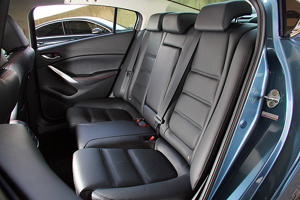 轉換至後座,雖然從外觀而言,新一代的Mazda6動感的外型可能被視作一款偏重自駕訴求的中大型房車,但19公分的膝部空間與150.5公分的後座寬度仍有水準之上的表現。不過,就如同駕駛座頭部空間一般,垂直空間受到外觀造型的影響而並不出色,僅能帶來3.5公分的頭部空間,椅面距車頂也僅有90公分的數值。然而,包覆性與支撐性出色的座椅設計,卻也減緩了乘坐時的不適,同時符合動感的外觀設計。