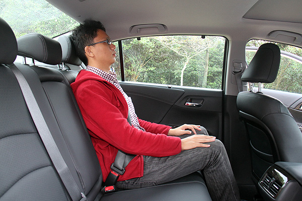 在並不突出的前座空間之外,Accord意外的擁有不俗的後座空間表現,26.5公分的膝部空間,是3款車中最出色的表現,4.5公分的頭部空間亦相當稱職,搭配上153公分的後座寬度,以及91公分的椅面距車頂高度,Accord雖然軸距最短,卻運用大尺碼的體型創造優異的乘坐空間。同時,也依循前座的座椅配置,沙發化的柔軟座椅,期望貼近的是追求舒適性的消費者需求。
