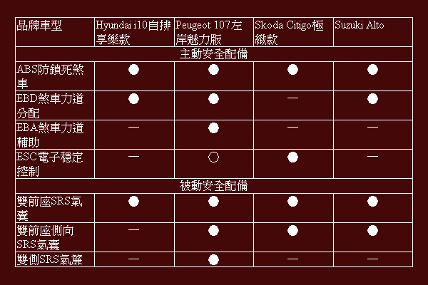 反觀Suzuki Alto、Hyundai i10兩款日韓品牌的小車,在台灣所上市的車型,於歐洲市場實屬中低階的車型,兩者的歐規車型部份可加價選配ESC / ESP,但台灣上市的Alto、i10皆無,想多付錢也沒得選,因此在主、被動安全配備上仍欠完善,安全這方面,與歐規車型主被動安全配置相同的Peugeot 107、Skoda Citigo無疑勝出。
