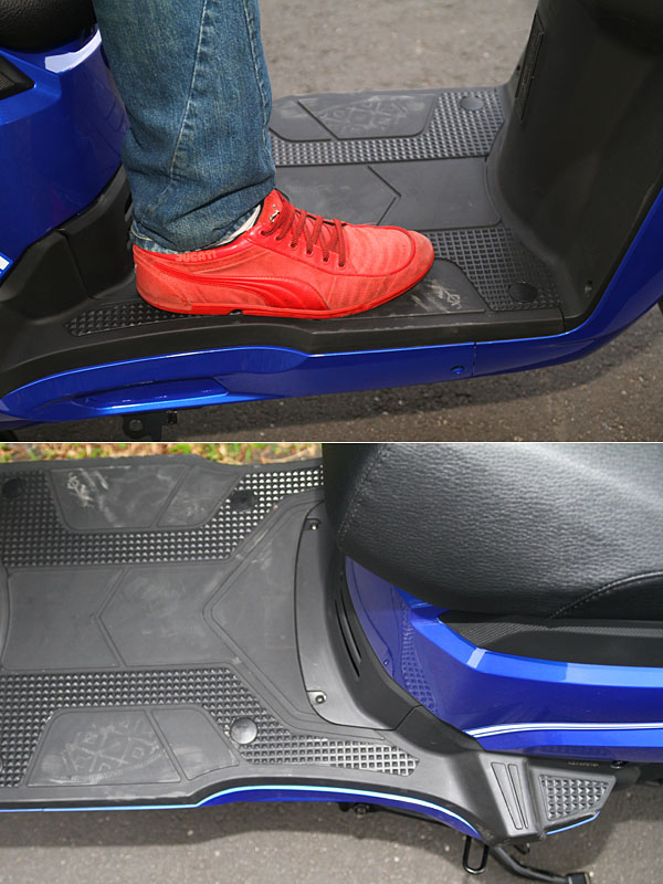 以US 10.5號鞋子尺碼示範,展現金發財拉長軸距的寬敞踏板空間,且除了低坐著點以外,踏板兩側還內修設計以便利騎士於停等時的雙腳擱放。