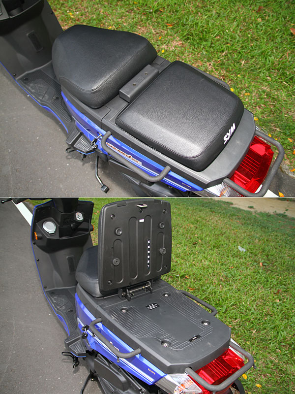 分離式的坐墊設計,可將後坐墊以直立擺放,就可將貨物固定在後方避免壓損坐墊,最大承載能力為30kg;此外於貨台三邊還有可供綑綁物品的貨架。