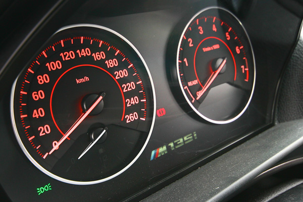 起初,與外型相似的,M135i並不會讓人感到猛爆威武,它是一輛快車,毫無疑問的,不過那種循序漸進的表現,十足名門世族氣度,淵渟嶽峙是我在得知它那猛暴動力數據後的直覺形容。而在隨後的追逐嬉戲間,隨著前方那刁鑽的A 45 AMG越跑越快,基於腎上腺素也基於職業道德,沒什麼理由不緊緊跟住看看這輛車的極限何在。在大直線裡,M135 i所短少給A 45 AMG的40匹馬力與0.5秒的0-100km/h加速成績差距確實清晰,但其實也並沒有過度劇烈,M135i或許因著大上一號3.0升直六渦輪增壓的排氣量與扭力,再加速時並不會讓前面那輛賓士跑得太遠(0-100km/h加速則因驅動輪差異才有如此大的距離),而一旦進入彎道,眼看A 45 AMG丟彎速度頗為瘋狂,但M135i就是能夠緊緊跟上,轉向不足感比起Audi S3顯然輕微,彎道一出頂點後灌下油門的瞬間,後軸的滑移程度也顯得漸進流暢,加上控制得宜的循跡控制系統,在合理的操控方式下根本不會介入雞婆,並容許相當幅度的驅動輪空轉與車尾滑動狀況,BMW性能車向來暢快淋漓的動態反應,在調校完美的M135i上頭依舊清晰可見。