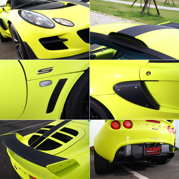 為呈現更對味的性能味,此輛Exige S240於車身空力套件處貼上了碳纖維飾貼,搭配上Exige GT3新式尾翼,有效增進空力效能,可在車速達到160 km/h時能維持42kg的下壓力,增強高速穩定性。